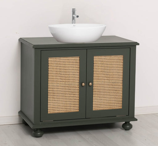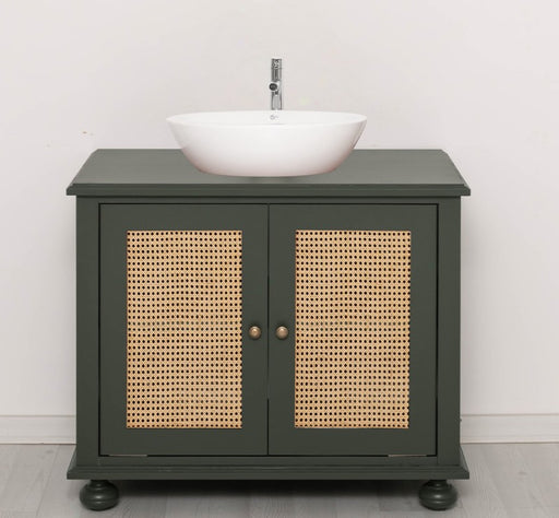 Großer Waschbeckenunterschrank aus Massivholz | Rattan Waschtisch für Aufsatzwaschbecken