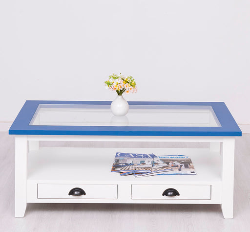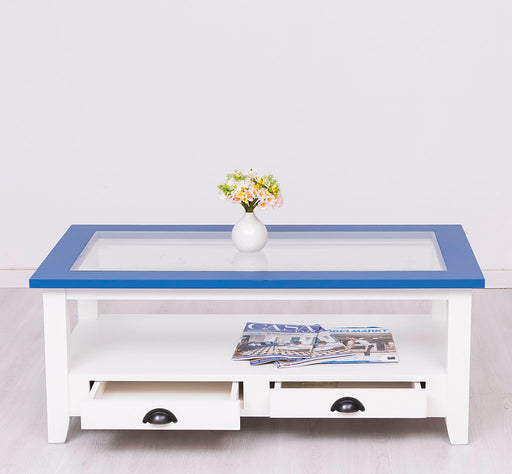 Jetzt Details anzeigenGlas-Couchtisch aus Massivholz mit zwei Schubladen