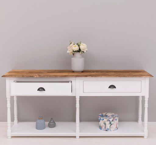 Jetzt Details anzeigenGroßer Vintage Konsolentisch aus Massivholz mit zwei Schubladen