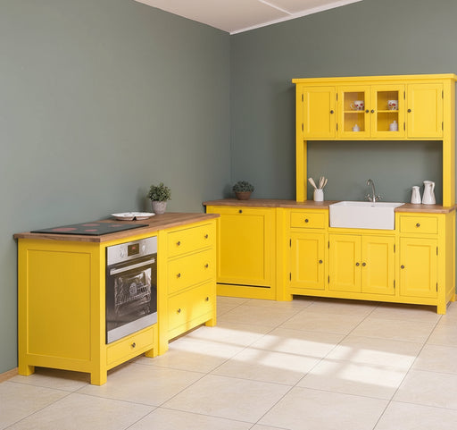 Küchenzeile aus Massivholz in Gelb- Komplette Massivholzküche mit freistehendem Geschirrschrank